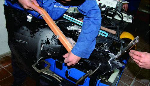 對鋁板的修復,為了防止在校正中因敲擊過重而導致鋁板過度拉伸,一般應使用膠錘、木錘,不能使用常規的鋼板整形工具。用鐵錘和墊鐵校正鋁板時,應注意以下兩點: