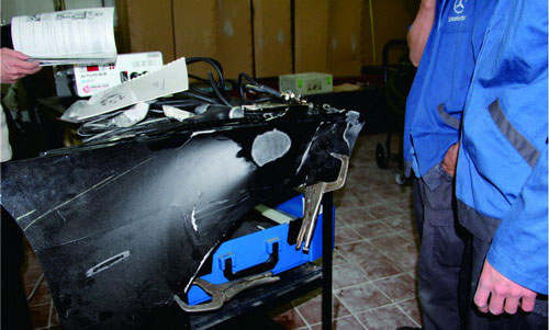 對于鋁板上的小凹陷,可以使用日照燈尋找凹陷點,再用撬棒頂壓法,從板件內側慢慢往外頂,但要注意不能過度頂壓,如圖1-91所示為撬棒頂壓法實例圖。