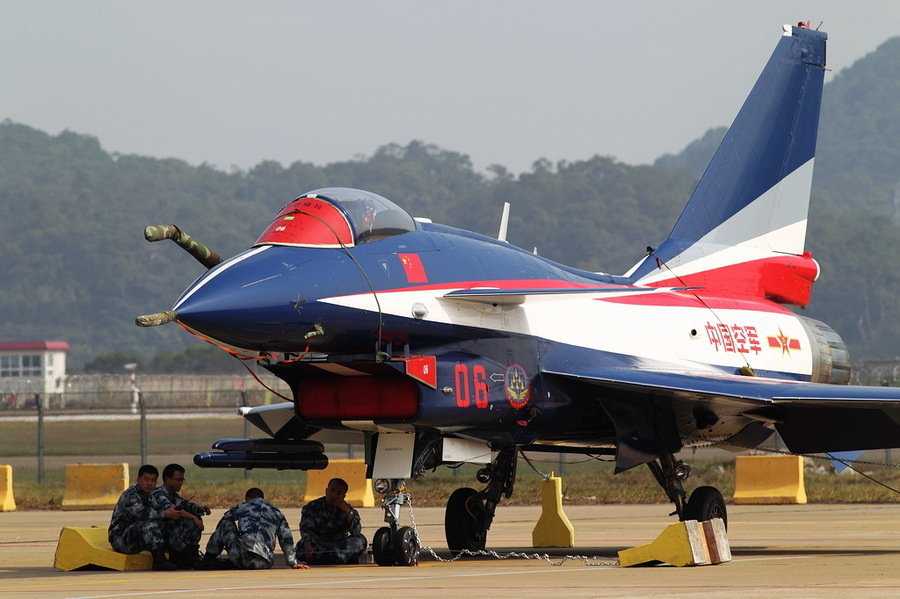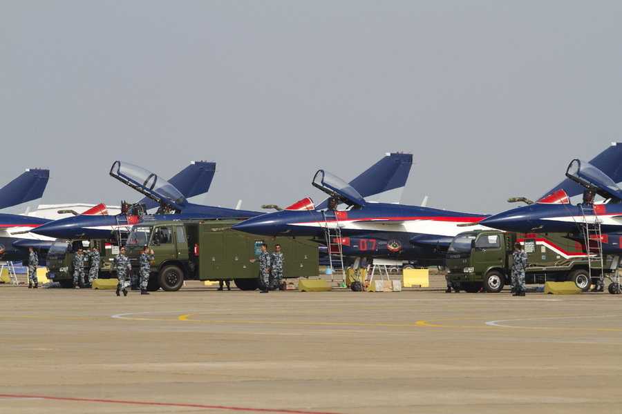 地面整備中的空軍八一飛行表演隊(duì)的殲10戰(zhàn)機(jī)。